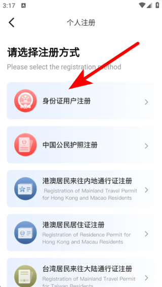 3、在注冊方式選擇頁面,選擇注冊的方式如身份證用戶注冊。