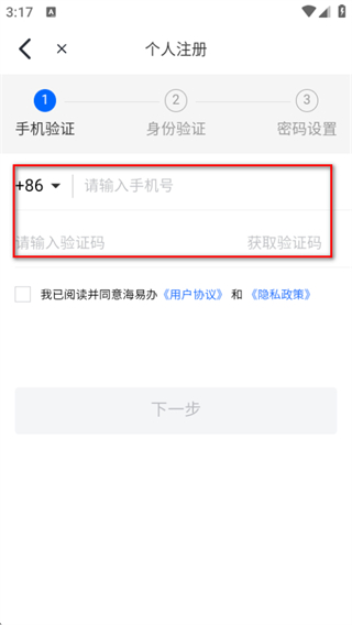 4、進入手機驗證環(huán)節(jié),輸入手機號、獲取并填寫驗證碼,完成后續(xù)注冊操作。