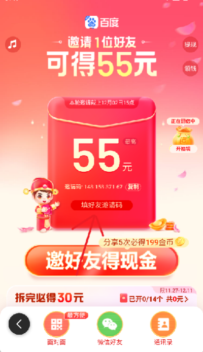 3、點(diǎn)擊后進(jìn)入邀請(qǐng)好友活動(dòng)界面,在中間的紅包位置有一個(gè)【填寫(xiě)好友邀請(qǐng)碼】的選項(xiàng),點(diǎn)擊一下即可填寫(xiě)好友的邀請(qǐng)碼。