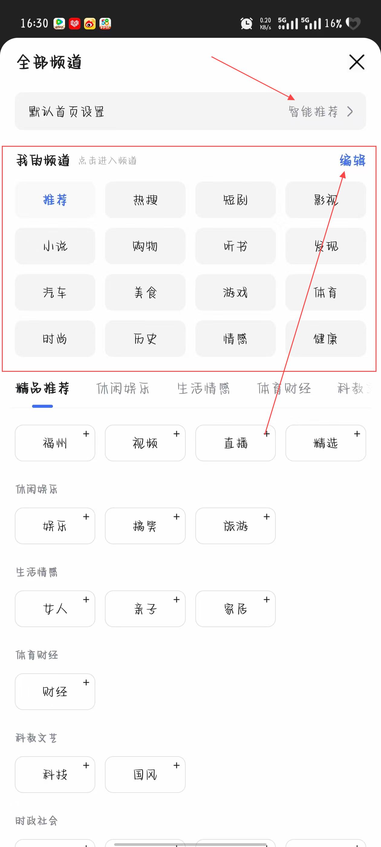 2、在全部頻道頁(yè)面,能看到我的頻道區(qū)域,點(diǎn)擊該區(qū)域右上角的編輯按鈕,即可對(duì)已添加到頻道欄的內(nèi)容進(jìn)行排序、刪除等操作。