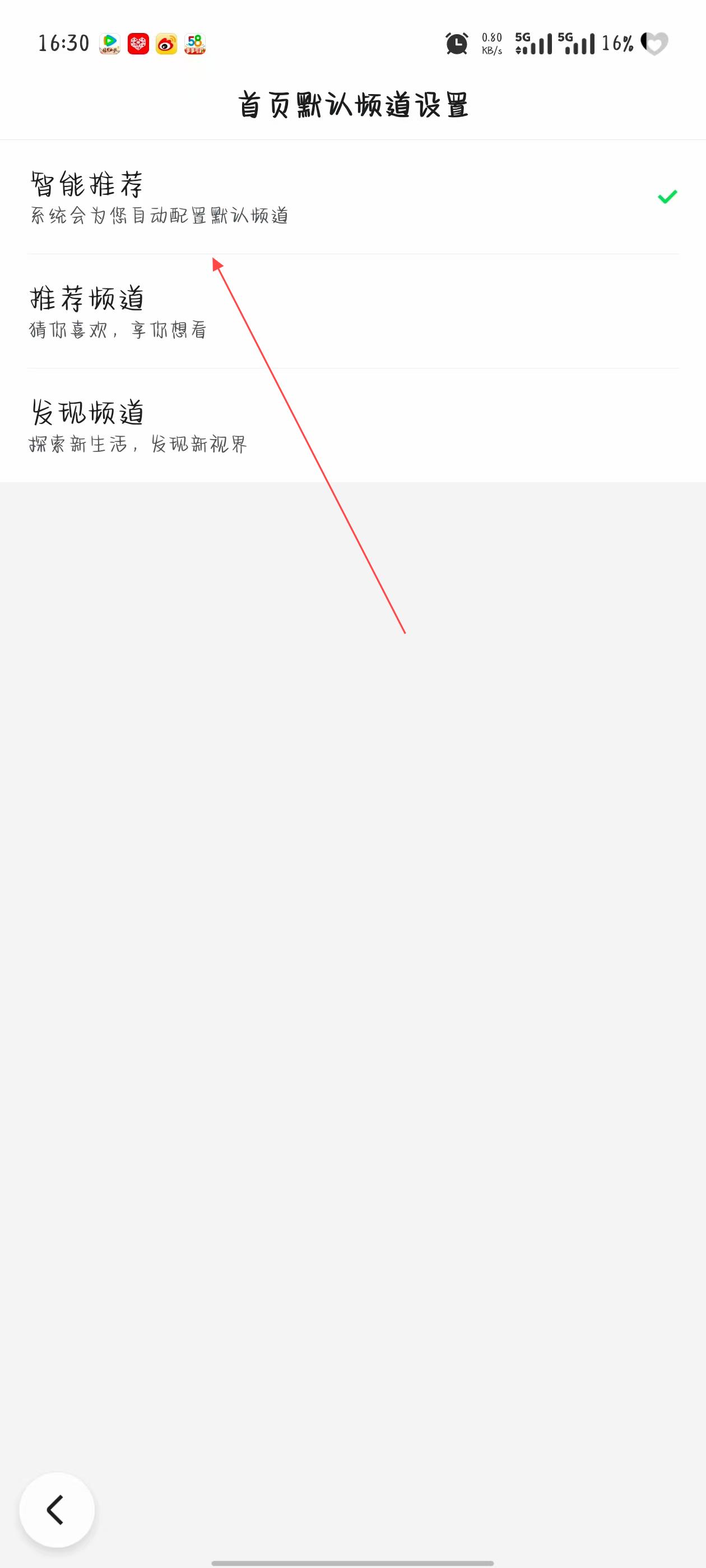 3、如果想要設(shè)置首頁(yè)默認(rèn)顯示的頻道類(lèi)型,點(diǎn)擊全部頻道頁(yè)面“默認(rèn)首頁(yè)設(shè)置右側(cè)的智能推薦,在彈出的首頁(yè)默認(rèn)頻道設(shè)置頁(yè)面中,選擇智能推薦,推薦頻道或者發(fā)現(xiàn)頻道等選項(xiàng)。
