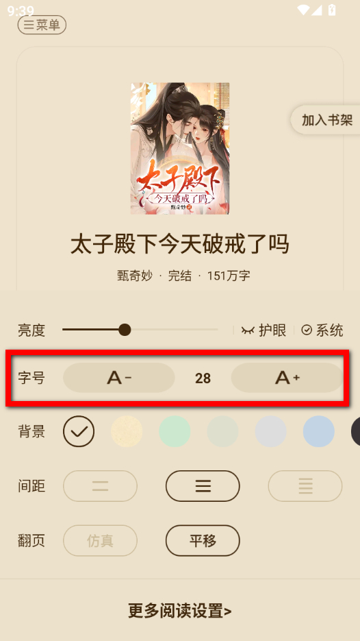 4、在閱讀設(shè)置界面,找到字號(hào)區(qū)域,點(diǎn)擊A-或A+調(diào)整字體大小。