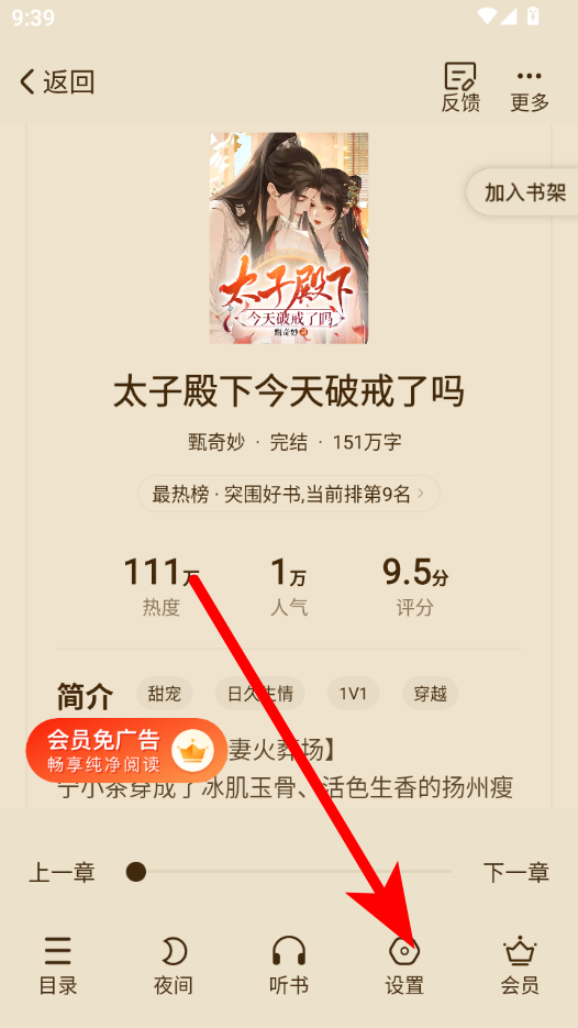 3、在小說(shuō)閱讀頁(yè)面,點(diǎn)擊設(shè)置選項(xiàng),進(jìn)入閱讀設(shè)置界面。