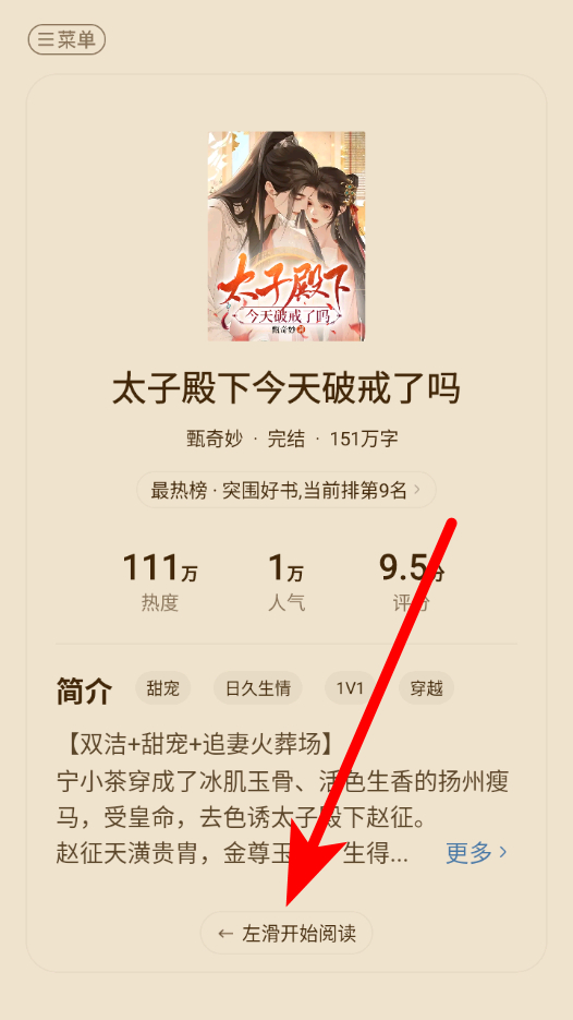 2、在小說(shuō)詳情界面,點(diǎn)擊左滑開(kāi)始閱讀,進(jìn)入小說(shuō)閱讀頁(yè)面。