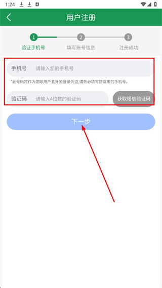 3、輸入手機(jī)號(hào),填入驗(yàn)證碼,點(diǎn)擊下一步。