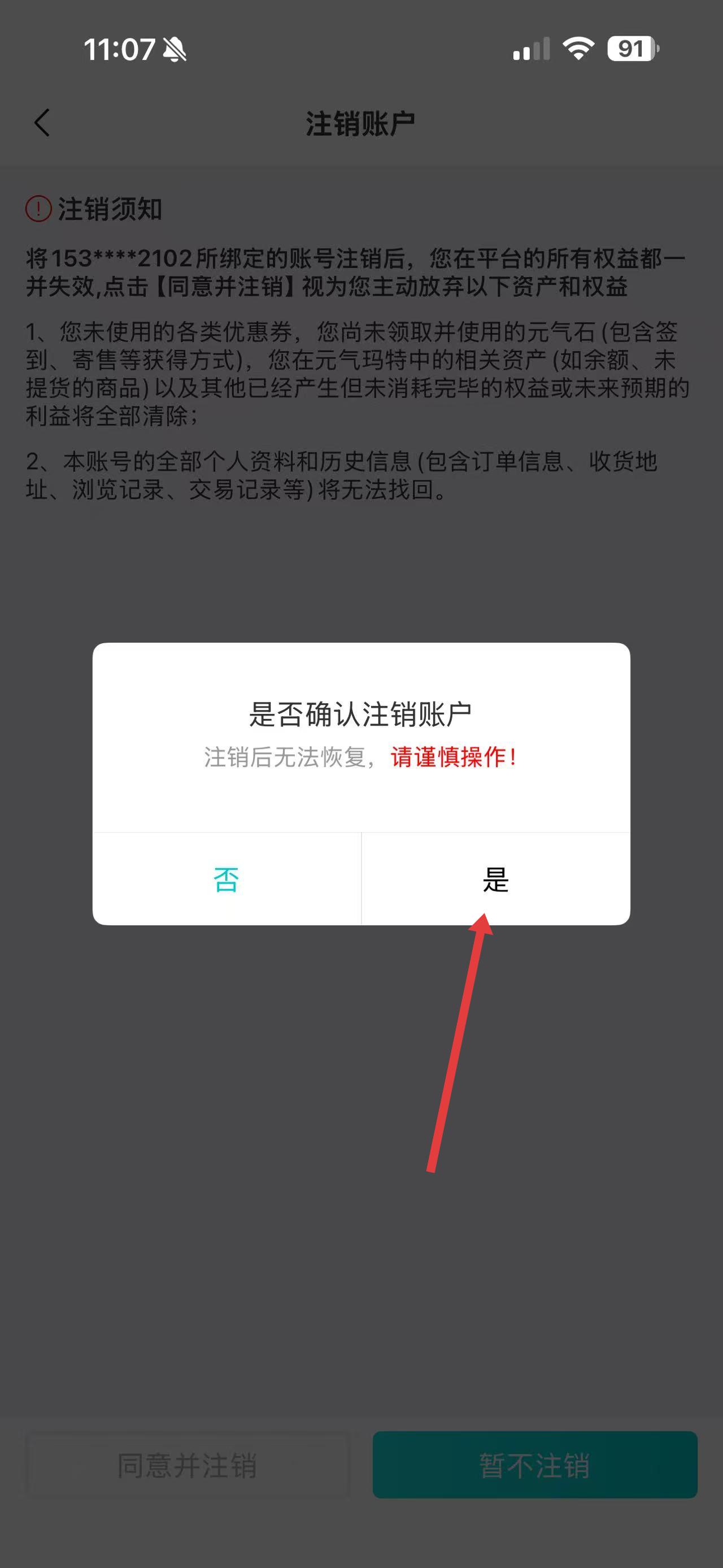 4、仔細(xì)閱讀注銷須知后,在彈出的確認(rèn)窗口中點(diǎn)擊是,按照提示操作即可完成賬號(hào)注銷。