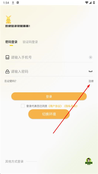 1、打開(kāi)袋鼠苗苗APP,在登錄界面點(diǎn)擊右上角的注冊(cè)選項(xiàng)。