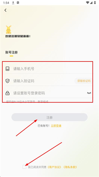 2、依次輸入手機(jī)號(hào)、驗(yàn)證碼,設(shè)置賬號(hào)登錄密碼,勾選協(xié)議,點(diǎn)擊注冊(cè)按鈕。