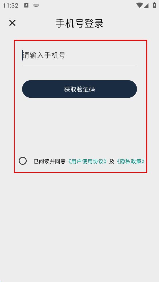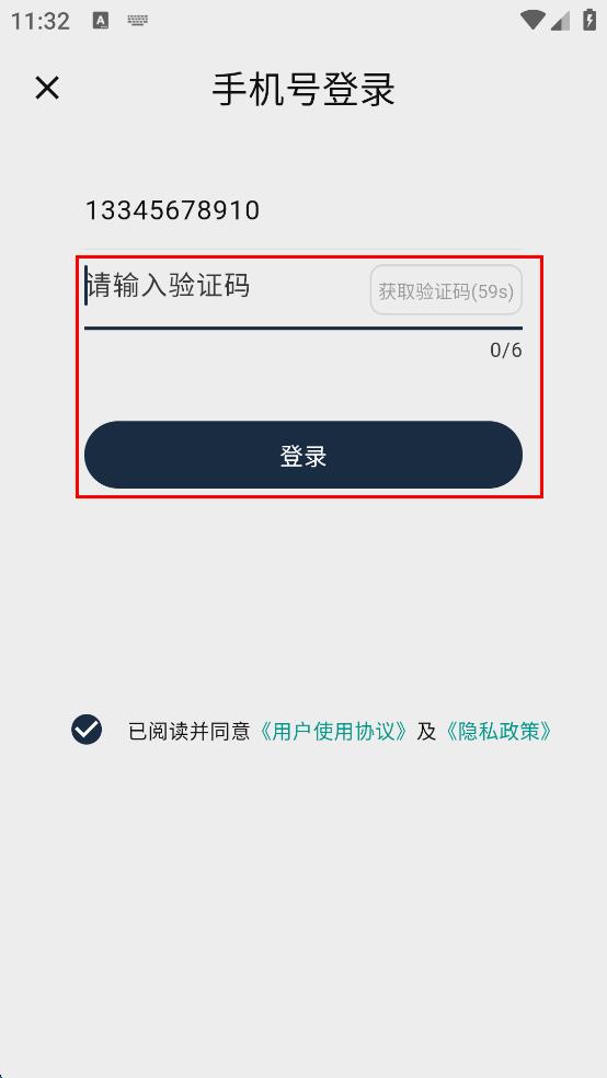 3、輸入手機(jī)號(hào),點(diǎn)擊獲取驗(yàn)證碼,勾選已閱讀并同意用戶使用協(xié)議及隱私政策。