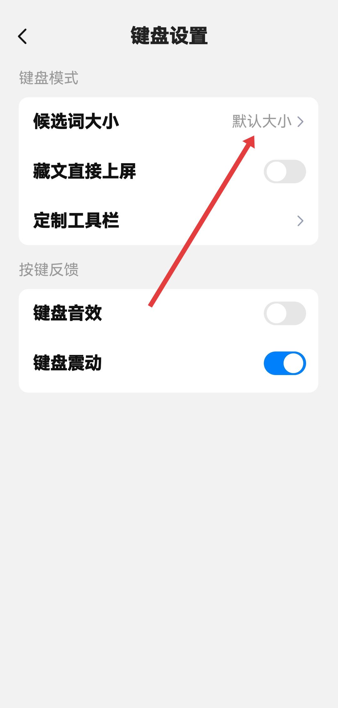 3、在鍵盤設(shè)置頁面,點(diǎn)擊候選詞大小選項(xiàng),進(jìn)入候選詞大小選擇界面。