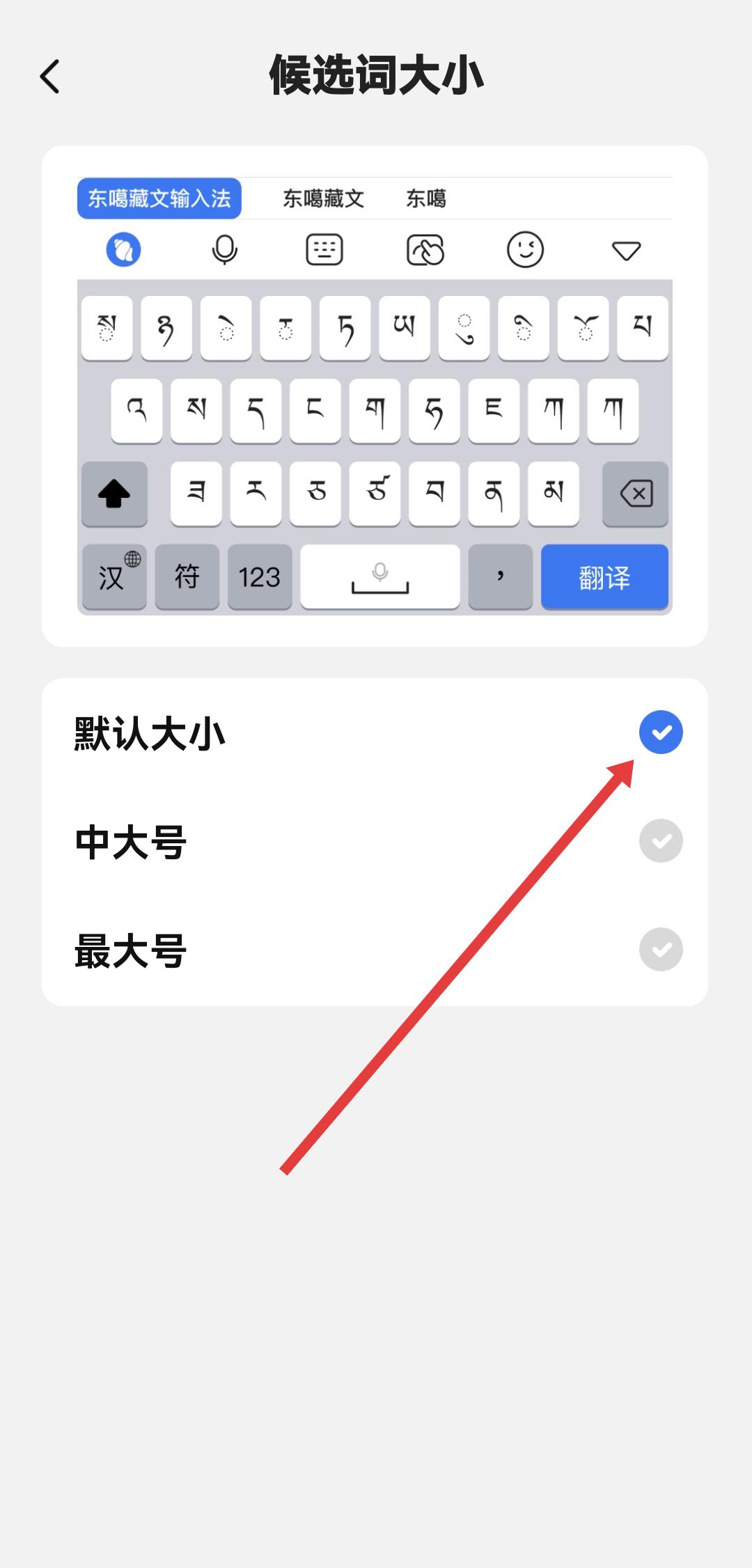 4、在候選詞大小界面,選擇要設(shè)置的候選詞大小,完成候選詞大小的設(shè)置。