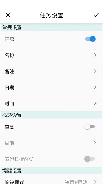 周期鬧鈴提醒功能。如:按年、月、周、日、小時(shí)、間隔循環(huán)設(shè)置鬧鈴提醒。提供每年生日、每月按揭、每周早起、每幾天換班等生活場景需求;