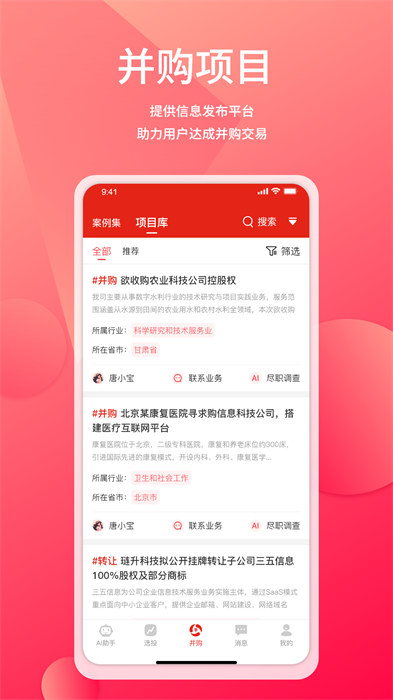管資本app給用戶帶來智能的管理服務(wù),豐富的資本運營等相關(guān)的信息帶用戶了解更多,了解企業(yè)相關(guān)的需求事項幫助解決問題,讓企業(yè)更好的獲取服務(wù)資源非常的方便,還有相關(guān)的并購項目內(nèi)容可以進行查詢,得到相關(guān)的項目信息來進行業(yè)務(wù)開展,對各個投資并購項目選取與參與并購,可以查看到需要的企業(yè)并購的案例信息,快來下載試試吧。