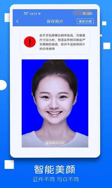 拍照后,可以一鍵自然美化人臉,可以微微放大眼睛、縮小嘴巴、美化皮膚,讓眼睛更有神,讓證件照更好看更氣質(zhì);更有補(bǔ)光功能,讓證件照更專業(yè)、美得更自然。