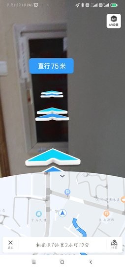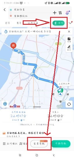 3、路線規(guī)劃以后在下圖所示部位向左滑動(dòng)選中步行導(dǎo)航,這是下方就會(huì)出現(xiàn)實(shí)景導(dǎo)航功能