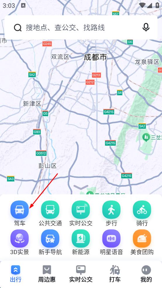 2、在主界面下方功能欄,找到“駕車”圖標(biāo),點(diǎn)擊進(jìn)入駕車導(dǎo)航設(shè)置頁面,準(zhǔn)備規(guī)劃駕車路線 。