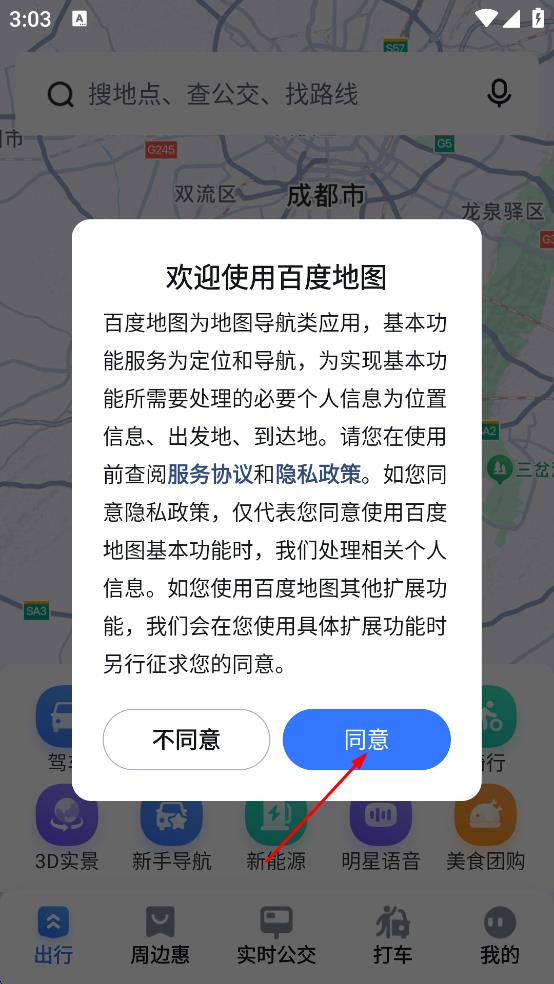 1、打開百度地圖,彈出歡迎使用彈窗,閱讀服務(wù)協(xié)議和隱私政策后,點(diǎn)擊“同意”,進(jìn)入地圖主界面 。