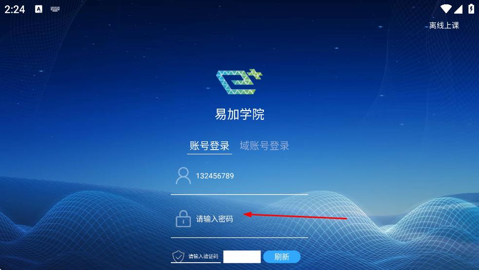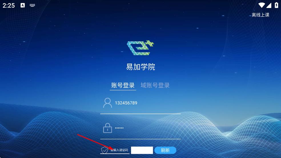 2、進(jìn)入易加學(xué)院登錄界面,界面有“賬號(hào)登錄”“域賬號(hào)登錄”選項(xiàng),還有賬號(hào)、密碼、驗(yàn)證碼輸入框,在賬號(hào)輸入框中輸入賬號(hào)。