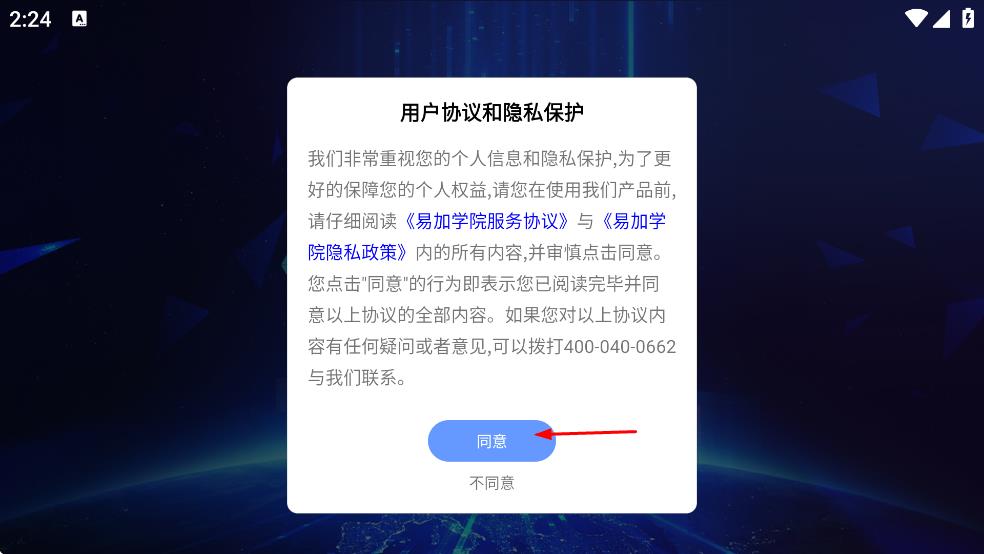 1、打開易加學(xué)院,進(jìn)入用戶協(xié)議和隱私保護(hù)界面,界面說(shuō)明重視個(gè)人信息保護(hù),需閱讀易加學(xué)院服務(wù)協(xié)議與易加學(xué)院隱私政策,點(diǎn)擊“同意”按鈕。