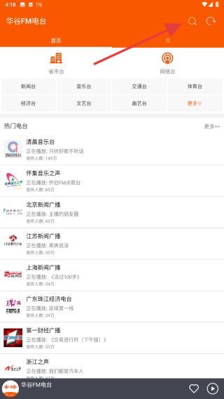 1、點(diǎn)擊華谷FM電臺APP,在首頁內(nèi)右上方點(diǎn)擊搜索的圖標(biāo)。