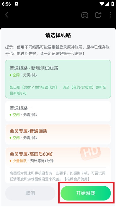 4、點擊云玩之后,就會進(jìn)入到選擇路線的界面,在這里選擇自己想要的路線,然后點擊【開始游戲】開始體驗。
