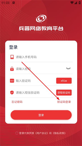 1、打開兵器網(wǎng)絡教育平臺app,找到并點擊驗證碼登錄選項。