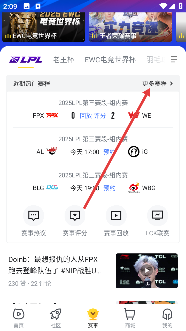 1、在賽事頁面,點擊近期熱門賽程右側(cè)的更多賽程,進(jìn)入賽程列表頁。