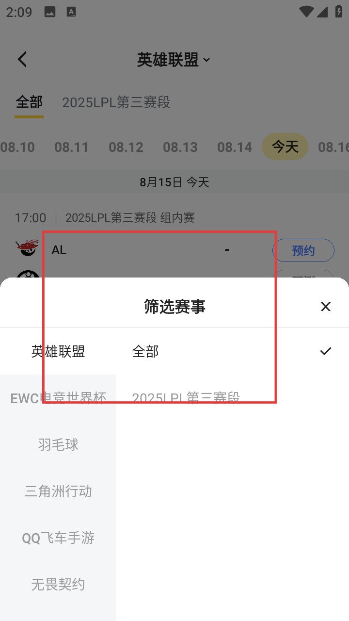 2、在賽程列表,通過篩選賽事功能,選擇英雄聯(lián)盟及具體賽事階段如2025LPL第三賽段,精準(zhǔn)查找想看的比賽。