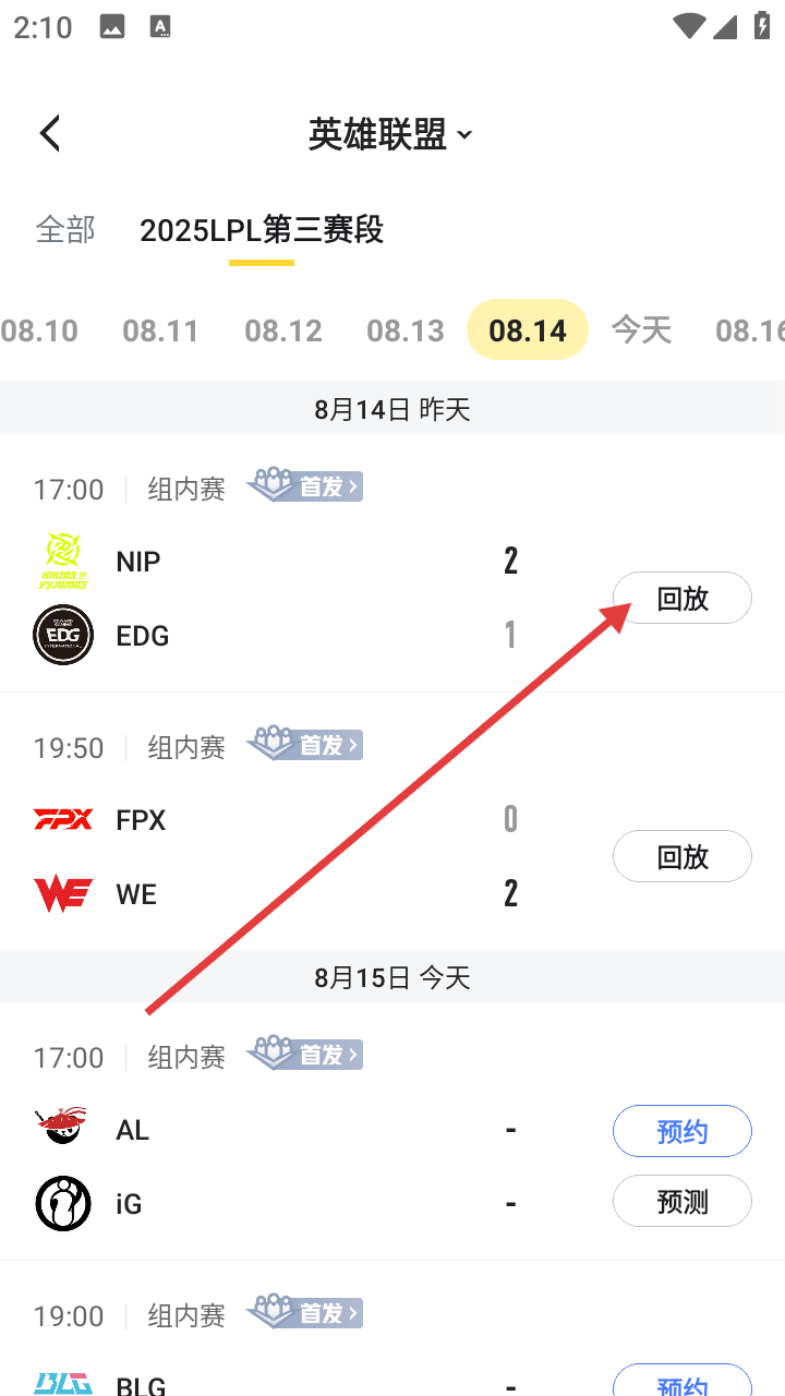3、找到對應(yīng)賽事如8月14日NIPvsEDG的比賽,點擊回放按鈕,即可觀看賽事回放內(nèi)容。