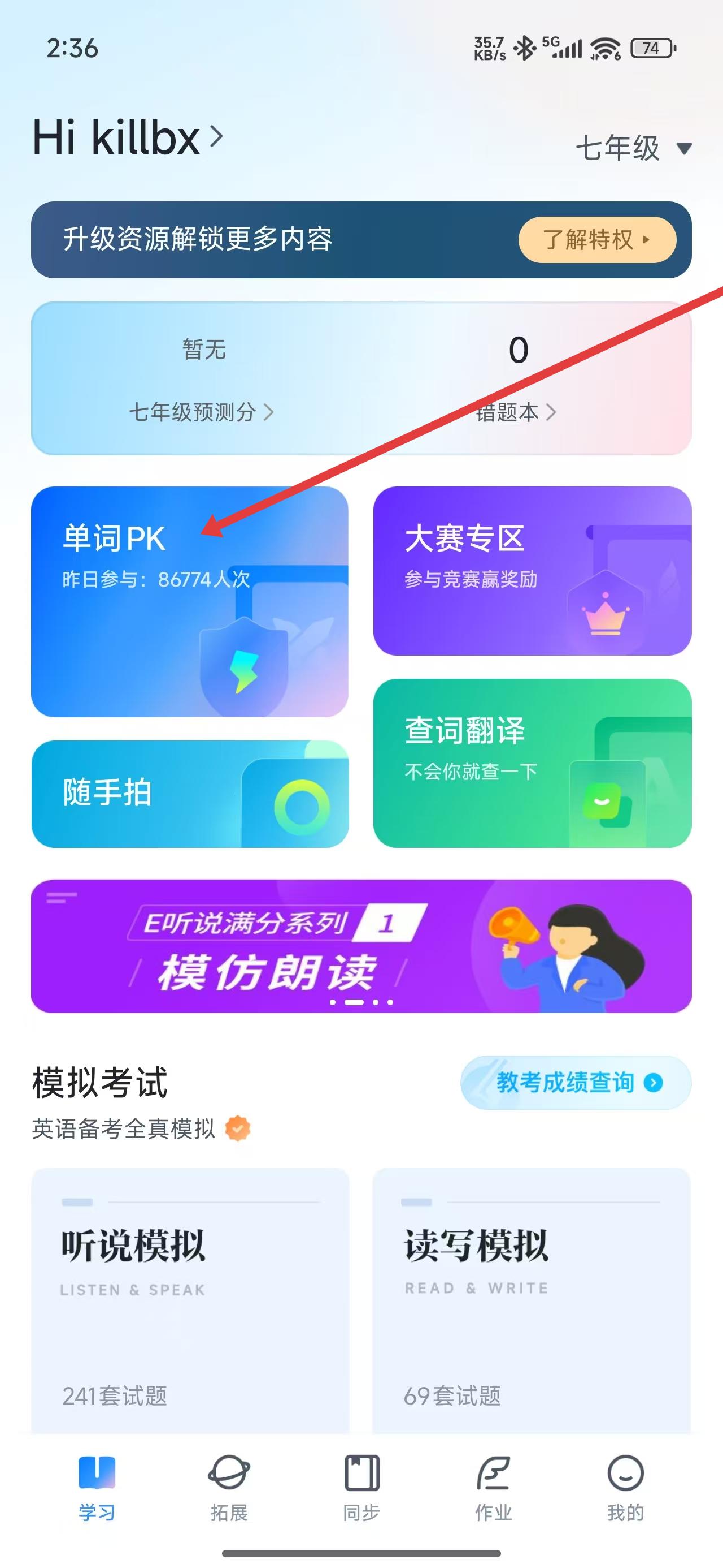 1、登錄E聽說APP后,在學(xué)習(xí)首頁點擊單詞PK模塊,進(jìn)入單詞PK功能界面。