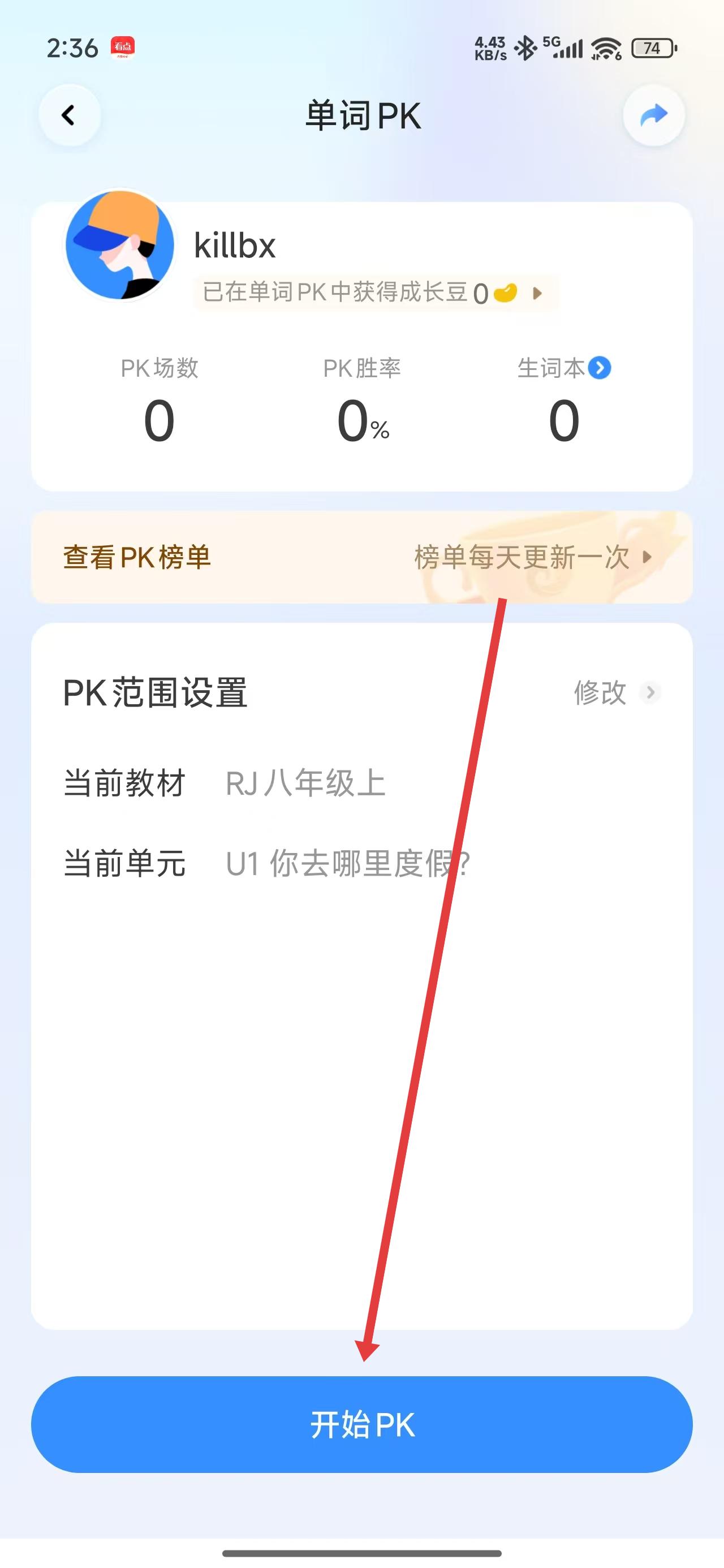 2、單詞PK界面點擊底部開始PK按鈕,啟動單詞對戰(zhàn)游戲。