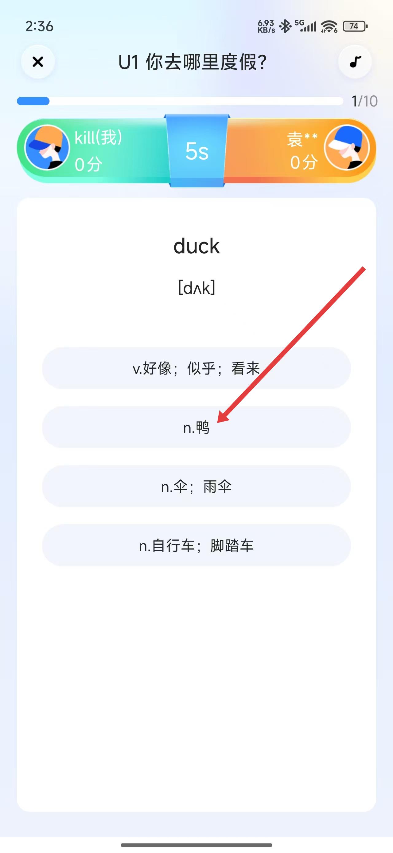 3、對戰(zhàn)答題時,選擇單詞duck對應(yīng)的正確釋義n.鴨,完成該題作答。
