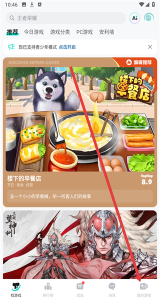 1、在進(jìn)入到首頁(yè)中時(shí),可以點(diǎn)擊下方我的游戲按鈕,進(jìn)入我的主頁(yè)查看。