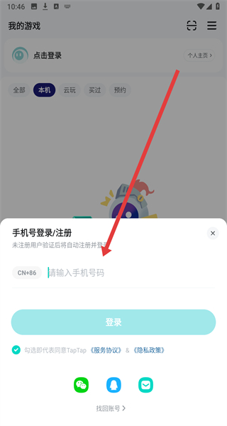 如果你想玩taptap中的云游戲,首先得登錄賬號(hào)。如果沒(méi)有賬號(hào),同樣也是像下面一樣操作。