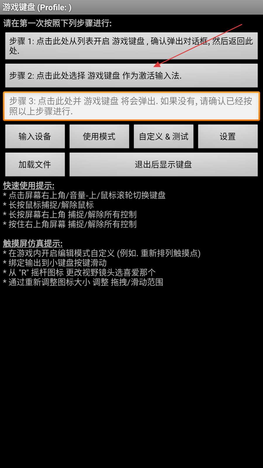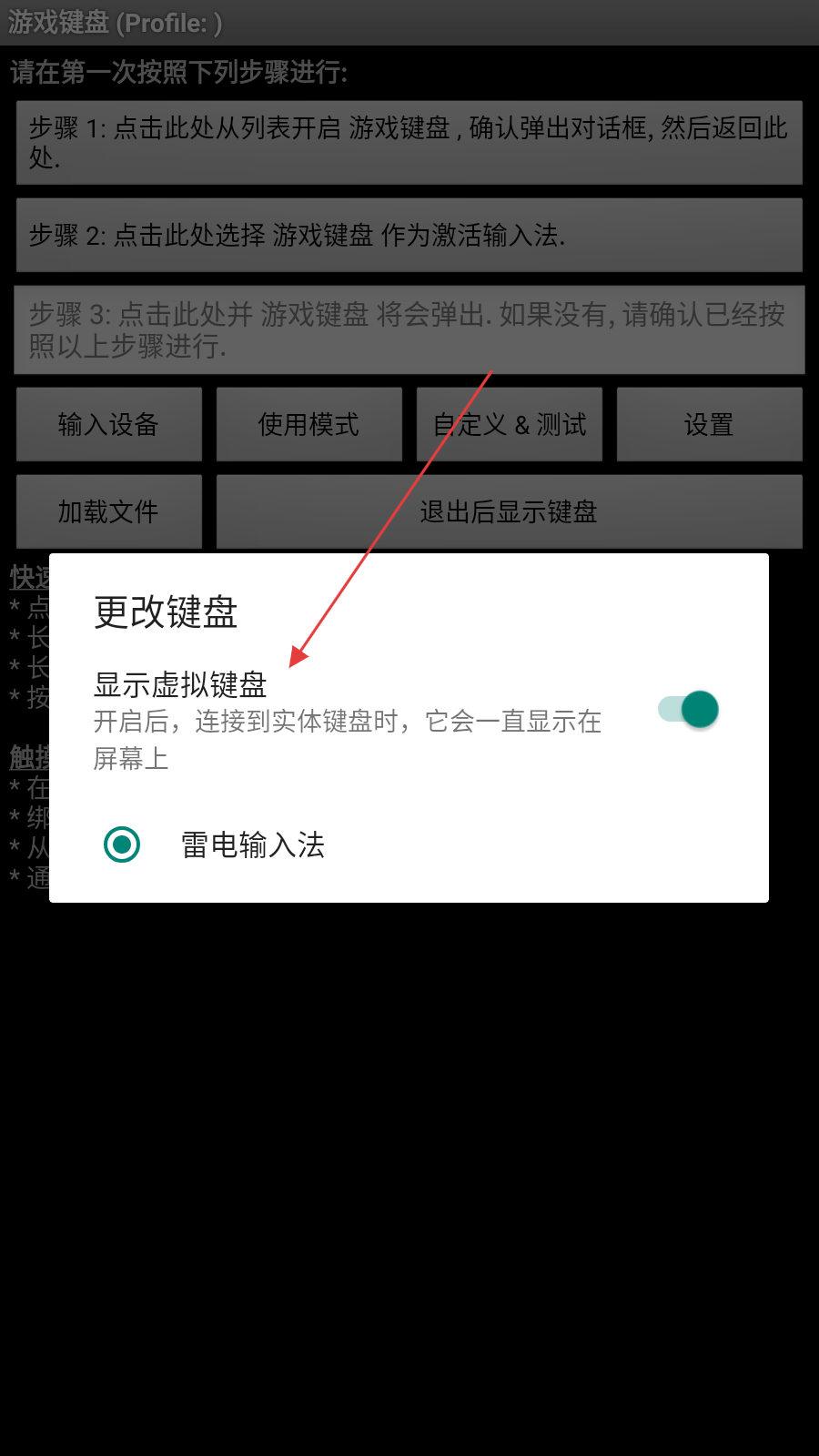 2、點(diǎn)擊步驟3讓游戲鍵盤(pán)彈出,若未彈出需確認(rèn)前兩步是否正確執(zhí)行,還可點(diǎn)擊設(shè)置,在更改鍵盤(pán)選項(xiàng)里,按需開(kāi)啟顯示虛擬鍵盤(pán)等功能。