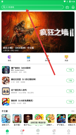 1、點(diǎn)擊應(yīng)用頂部搜索欄,輸入游戲相關(guān)關(guān)鍵詞,開啟游戲查找流程,可搜索如瘋狂之墻Ⅱ等游戲資源。