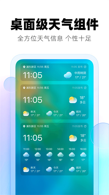 卡片式天氣背景,以彩虹色塊的形式展示天氣信息,跟隨天氣變化交替更換,簡約精美