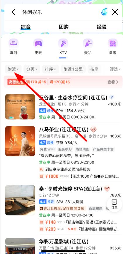 3、進入后默認展示周邊相關美食或酒店信息,可點擊附近選項設置搜索范圍,篩選符合需求的美食或酒店。