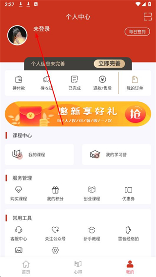 2、在個人中心頁面,點擊頭像旁邊未登錄區(qū)域,進入登錄界面。