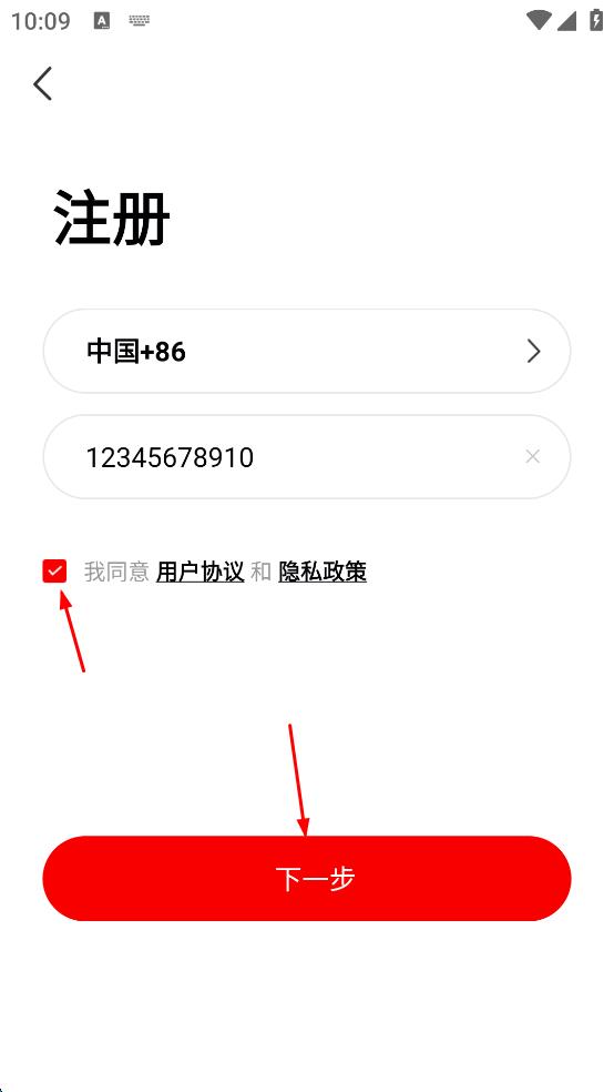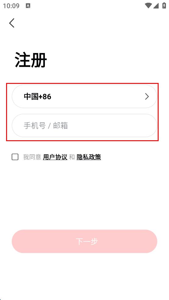 4、完成手機號或郵箱輸入后,勾選“我同意用戶協(xié)議和隱私政策”,接著點擊“下一步”按鈕,按照后續(xù)提示完成注冊操作。