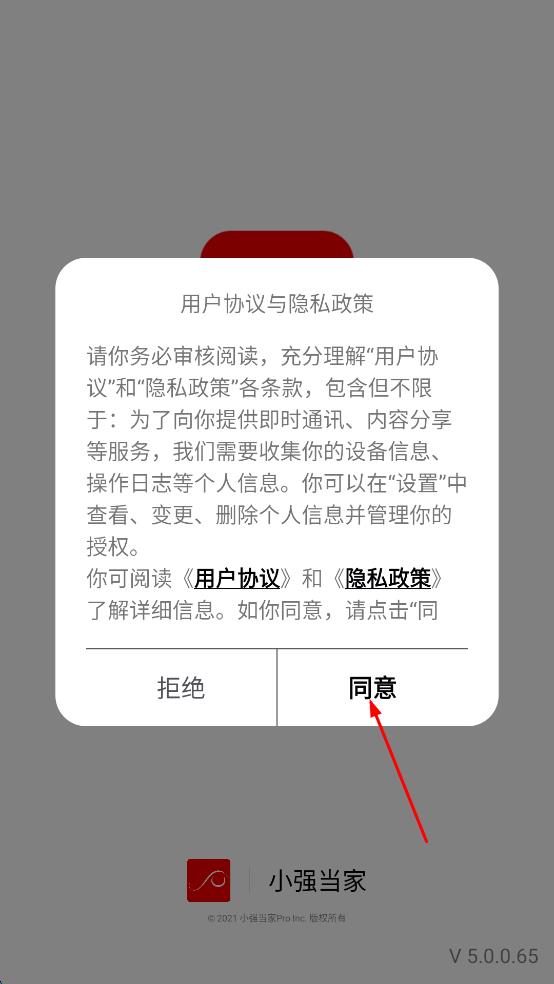 1、打開小強當家APP,在彈出的用戶協(xié)議與隱私政策提示框中,點擊“同意”按鈕。