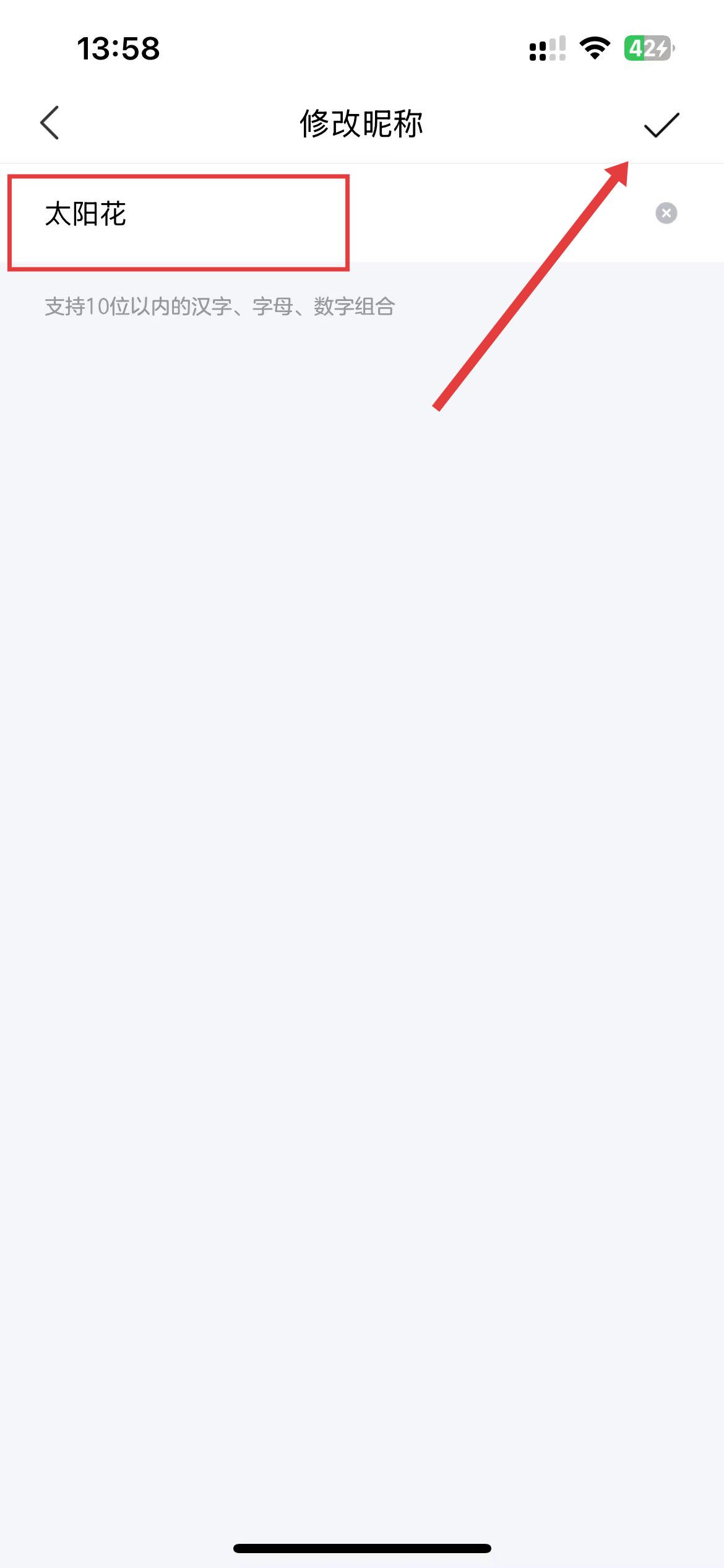 4、在修改昵稱界面輸入想要設(shè)置的新昵稱,確認(rèn)輸入無(wú)誤后,點(diǎn)擊右上角的對(duì)勾圖標(biāo)完成修改。