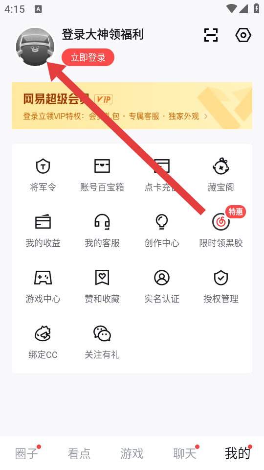 1、打開網(wǎng)易大神APP,點(diǎn)擊底部導(dǎo)航欄最右側(cè)的我的,進(jìn)入個人中心頁面,可以查看賬號百寶箱、我的收益等功能入口。