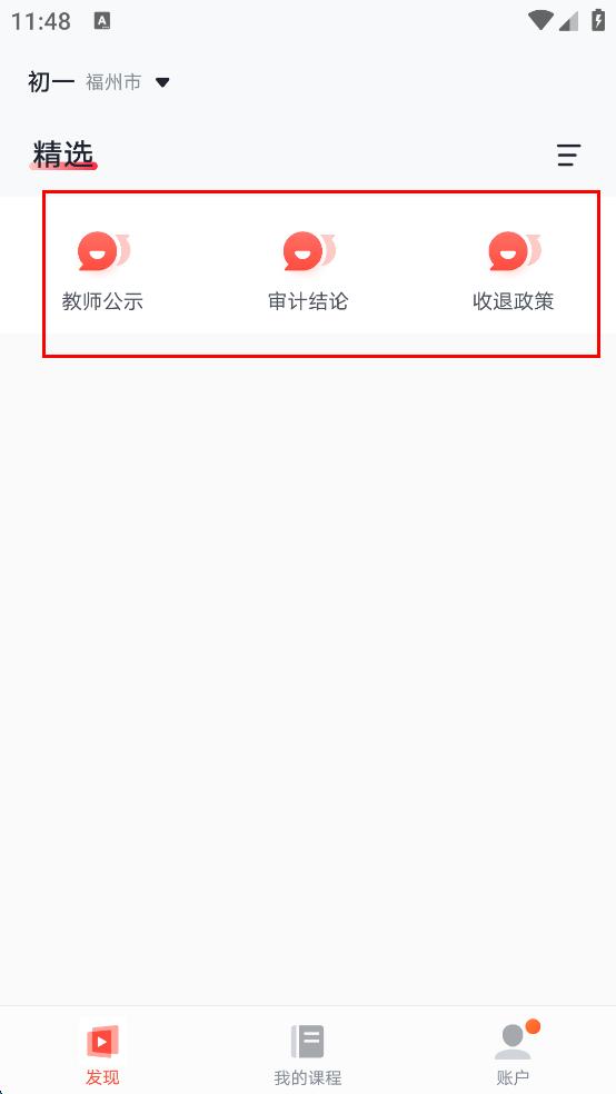 4、完成地區(qū)和年級(jí)選擇后,進(jìn)入精選頁(yè)面,可根據(jù)需要點(diǎn)擊“教師公示”“審計(jì)結(jié)論”“收退政策”等選項(xiàng),查看相關(guān)內(nèi)容。