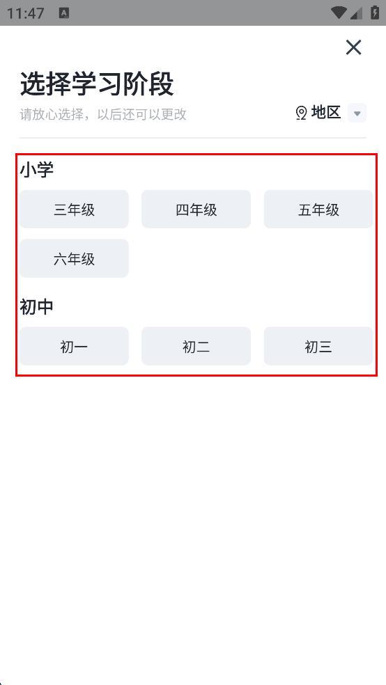 3、進(jìn)入“選擇學(xué)習(xí)階段”頁(yè)面后,先點(diǎn)擊右上角“地區(qū)”選項(xiàng),選擇所在地區(qū),然后在小學(xué)或初中的年級(jí)選項(xiàng)中,點(diǎn)擊對(duì)應(yīng)的年級(jí)。