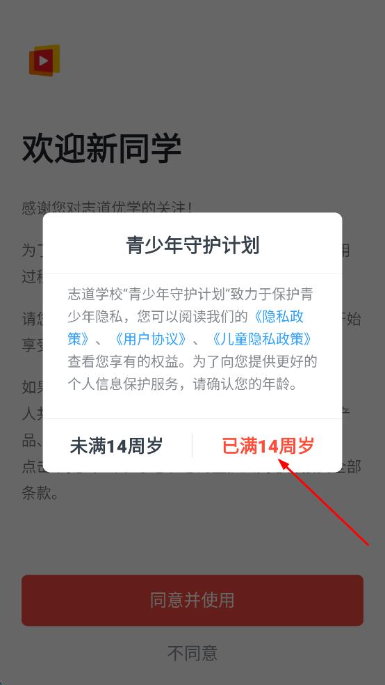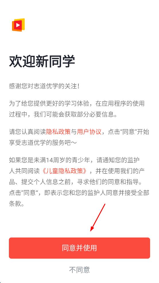 1、打開(kāi)志道優(yōu)學(xué)APP,在“歡迎新同學(xué)”頁(yè)面,點(diǎn)擊“同意并使用”按鈕。