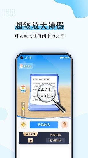 超級(jí)放大神器在這里你可以隨時(shí)隨地放大圖片上的文字,你可以自由設(shè)置放大的倍數(shù),放大后的內(nèi)容也是清晰可見的,智能的補(bǔ)光模式讓你看得更加清晰。你還可以使用放大鏡來觀察遠(yuǎn)方的景色,適合出門旅游使用,里面還有萬年歷功能。歡迎有需要的朋友下載使用!