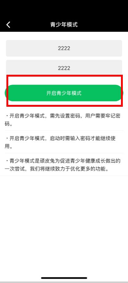 4.、輸入并確認(rèn)密碼后,點(diǎn)擊綠色的開(kāi)啟青少年模式按鈕,即可成功開(kāi)啟。
