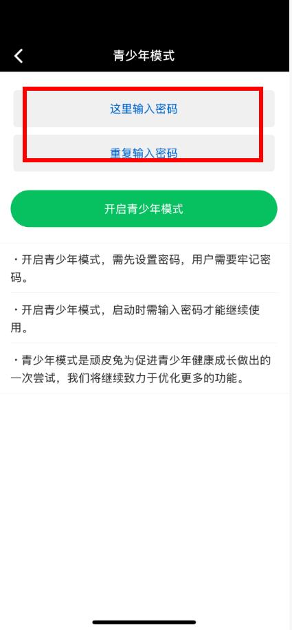 3.、在青少年模式設(shè)置頁(yè)面,分別在這里輸入密碼和重復(fù)輸入密碼的輸入框中,設(shè)置并確認(rèn)你的密碼。