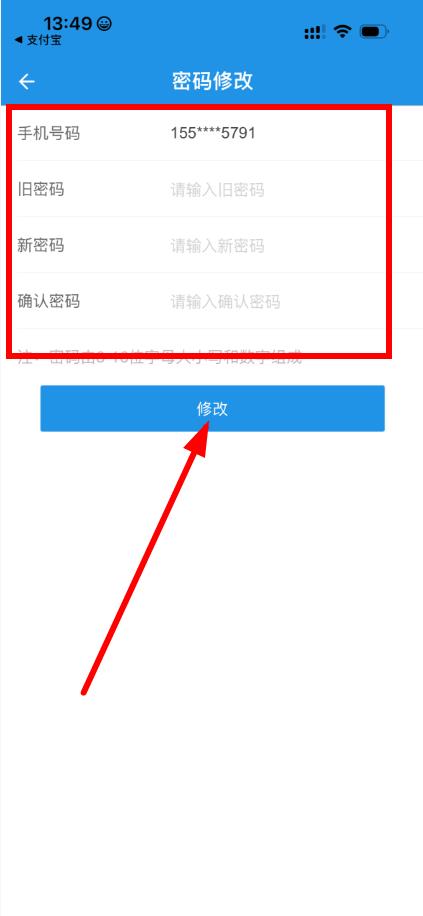 4、在密碼修改頁(yè)面,輸入手機(jī)號(hào)、舊密碼、新密碼以及確認(rèn)密碼后,點(diǎn)擊修改按鈕即可完成密碼修改。